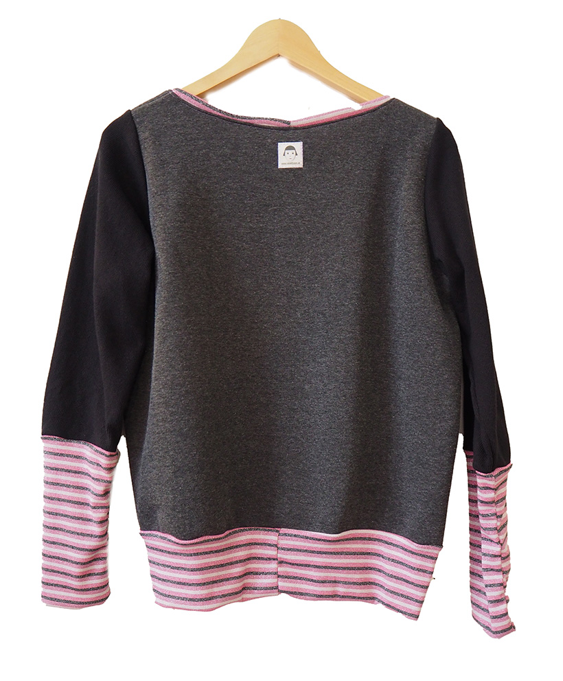 dieses handgemachte langarm oberteil ist weit geschnitten und hat einen enger geschnittenen, niedrigen bund. der hauptteil ist aus kuscheligem sweaterstoff, die ärmel aus baumwollstrick und das bündchen und der kragen aus kunstfaserjersey.