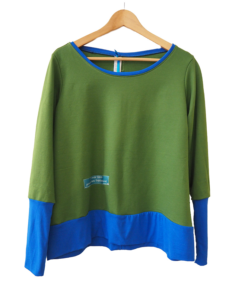 dieses handgemachte langarm oberteil ist weit geschnitten und hat einen weit geschnittenen, niedrigen bund. der hauptteil ist aus weichem bio sommersweat, das bündchen und der kragen aus baumwolljersey.